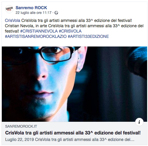 Cristian Nevola il musicista di Roma nel web chiamato CrisVola annuncia con grande emozione la selezione all’ importantissimo festival nazionale